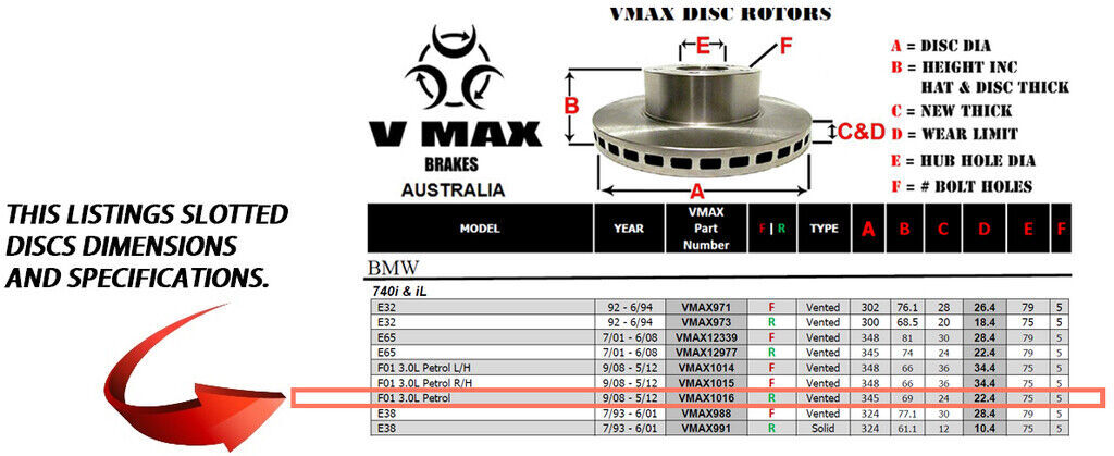 This sale is for a new pair (2 disc rotors) of Genuine VMAX Dimple Drilled & Slotted Performance Rear disc brake rotors to suit BMW 740i 740iL F01 3.0L Petrol models built 2008 till 2012 and are a direct replacement item.