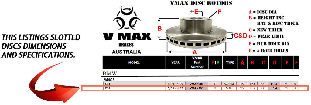 This sale is for a new pair (2 disc rotors) of Genuine VMAX Dimple Drilled & Slotted Performance Rear disc brake rotors to suit BMW 840Ci E31 models built 1989 till 1999 and are a direct replacement item.
