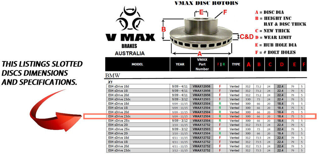 This sale is for a new pair (2 disc rotors) of Genuine VMAX Dimple Drilled & Slotted Performance Rear disc brake rotors to suit BMW X1 E84 sDrive 23dx models built 2009 till 2015 and are a direct replacement item.