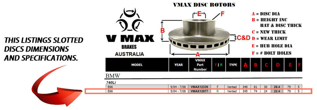 This sale is for a new pair (2 disc rotors) of Genuine VMAX Dimple Drilled & Slotted Performance Rear disc brake rotors to suit BMW 740Li E66 models built 2004 till 2008 and are a direct replacement item.