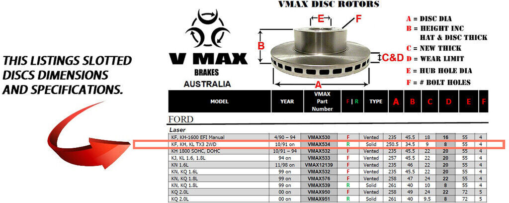 This sale is for a new pair (2 disc rotors) of Genuine VMAX Dimple Drilled & Slotted Performance Rear disc brake rotors to suit FORD Laser KF KH KL TX3 2WD models built 1991 Onwards and are a direct replacement item.