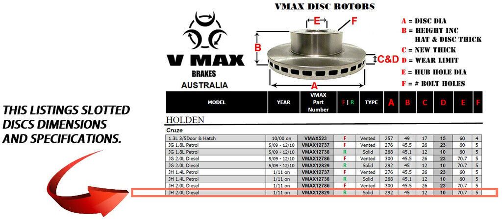 This sale is for a new pair (2 disc rotors) of Genuine VMAX Dimple Drilled & Slotted Performance Rear disc brake rotors to suit HOLDEN Cruze JH 2.0L Diesel models built 2011 Onwards and are a direct replacement item.