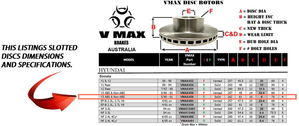 This sale is for a new pair (2 disc rotors) of Genuine VMAX Dimple Drilled & Slotted Performance Rear disc brake rotors to suit HYUNDAI Sonata Y3 ABS Non-ABS models built 1998 till 2001 and are a direct replacement item.