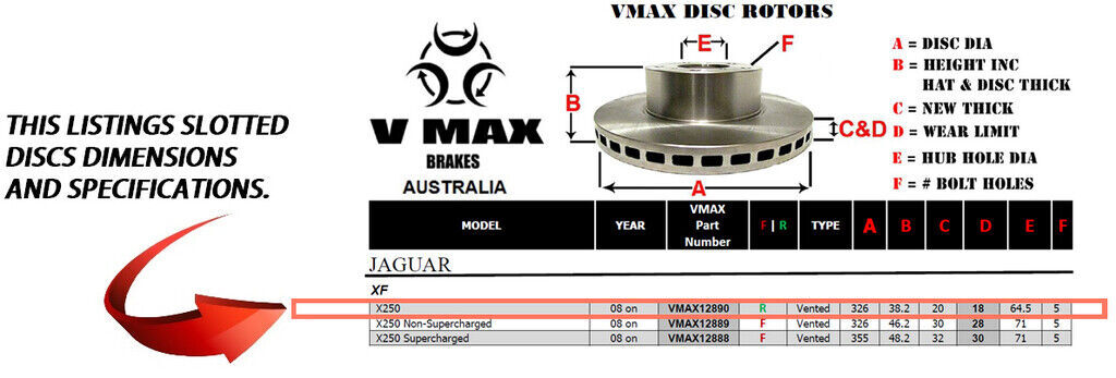 This sale is for a new pair (2 disc rotors) of Genuine VMAX Dimple Drilled & Slotted Performance Rear disc brake rotors to suit JAGUAR XF X250 models built 2008 Onwards and are a direct replacement item.