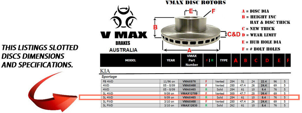 This sale is for a new pair (2 disc rotors) of Genuine VMAX Dimple Drilled & Slotted Performance Rear disc brake rotors to suit KIA Sportage SL 4WD models built 2009 Onwards and are a direct replacement item.