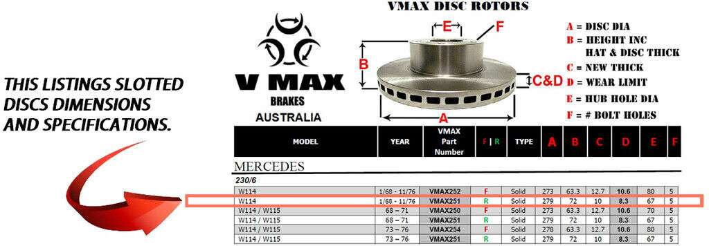 This sale is for a new pair (2 disc rotors) of Genuine VMAX Dimple Drilled & Slotted Performance Rear disc brake rotors to suit MERCEDES 230/6 W114 models built 1968 till 1976 and are a direct replacement item.