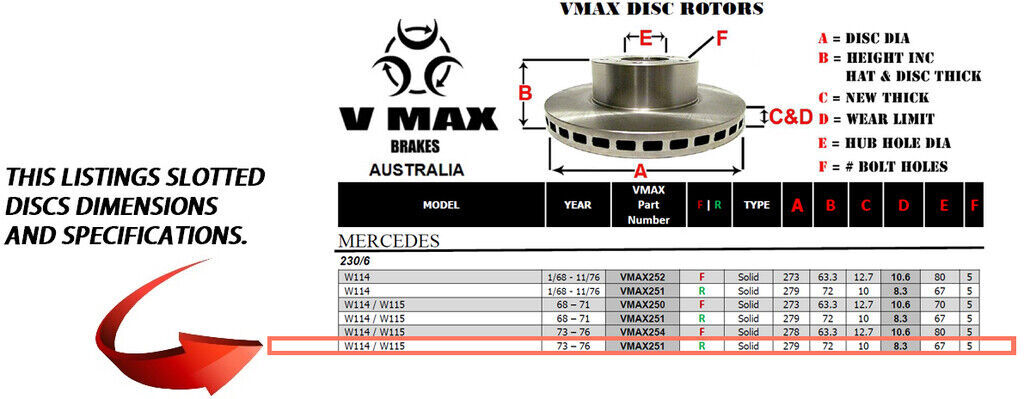 This sale is for a new pair (2 disc rotors) of Genuine VMAX Dimple Drilled & Slotted Performance Rear disc brake rotors to suit MERCEDES 230/6 W114 W115 models built 1973 till 1976 and are a direct replacement item.