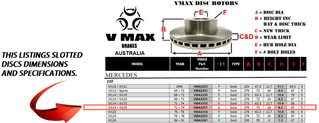 This sale is for a new pair (2 disc rotors) of Genuine VMAX Dimple Drilled & Slotted Performance Rear disc brake rotors to suit MERCEDES 230 W114 W115 models built 1971 till 1974 and are a direct replacement item.
