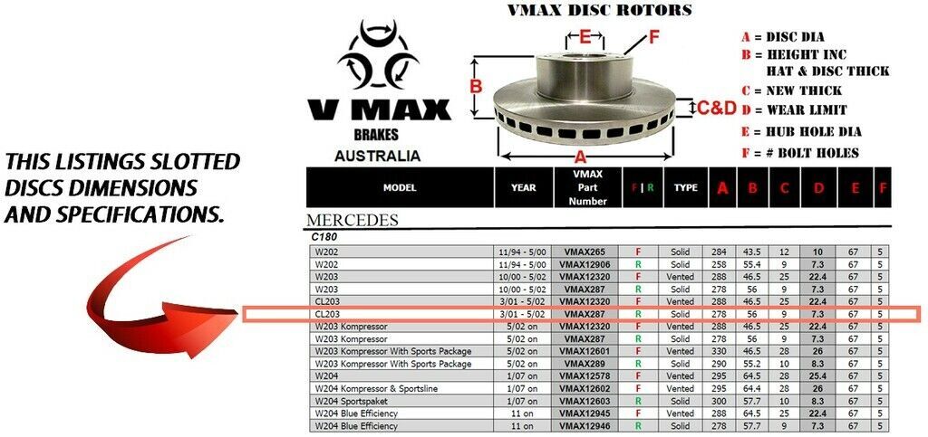 This sale is for a new pair (2 disc rotors) of Genuine VMAX Dimple Drilled & Slotted Performance Rear disc brake rotors to suit MERCEDES C180 CL203 models built 2001 till 2002 and are a direct replacement item.