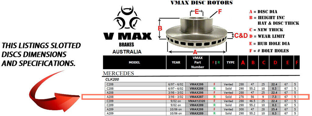 This sale is for a new pair (2 disc rotors) of Genuine VMAX Dimple Drilled & Slotted Performance Rear disc brake rotors to suit MERCEDES CLK200 A208 models built 1998 till 2002 and are a direct replacement item.