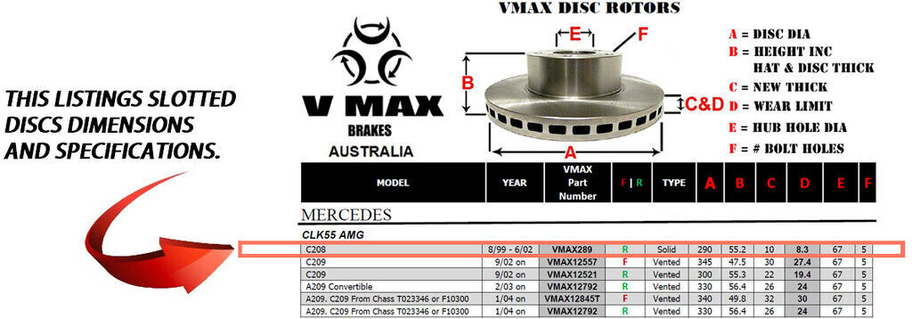 This sale is for a new pair (2 disc rotors) of Genuine VMAX Dimple Drilled & Slotted Performance Rear disc brake rotors to suit MERCEDES CLK55 AMG C208 models built 1999 till 2002 and are a direct replacement item.