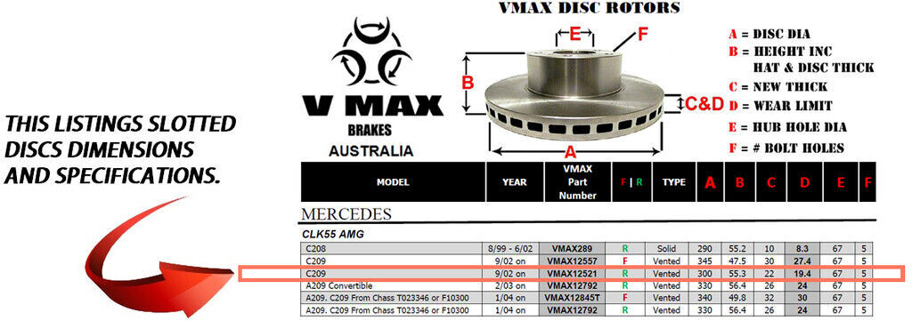 This sale is for a new pair (2 disc rotors) of Genuine VMAX Dimple Drilled & Slotted Performance Rear disc brake rotors to suit MERCEDES CLK55 AMG C209 models built 2002 Onwards and are a direct replacement item.