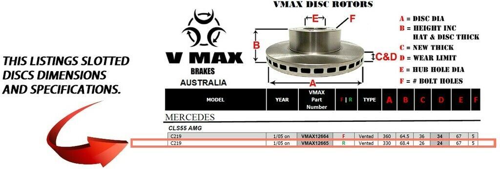 This sale is for a new pair (2 disc rotors) of Genuine VMAX Dimple Drilled & Slotted Performance Rear disc brake rotors to suit MERCEDES CLS55 AMG C219 models built 2005 Onwards and are a direct replacement item.