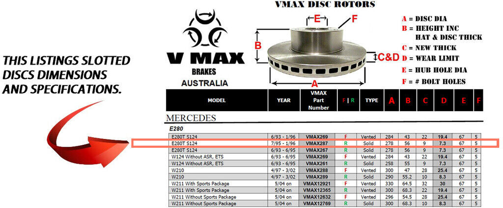 This sale is for a new pair (2 disc rotors) of Genuine VMAX Dimple Drilled & Slotted Performance Rear disc brake rotors to suit MERCEDES E280 E280T S124 models built 1995 till 1996 and are a direct replacement item.