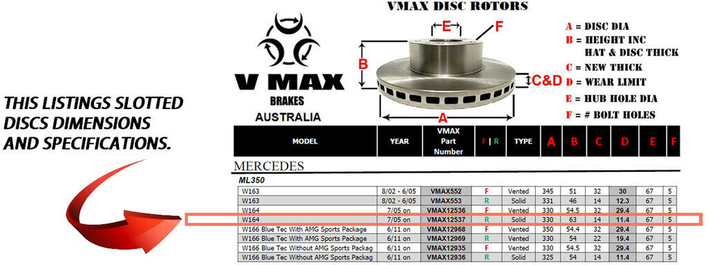 This sale is for a new pair (2 disc rotors) of Genuine VMAX Dimple Drilled & Slotted Performance Rear disc brake rotors to suit MERCEDES ML350 W164 models built 2005 Onwards and are a direct replacement item.