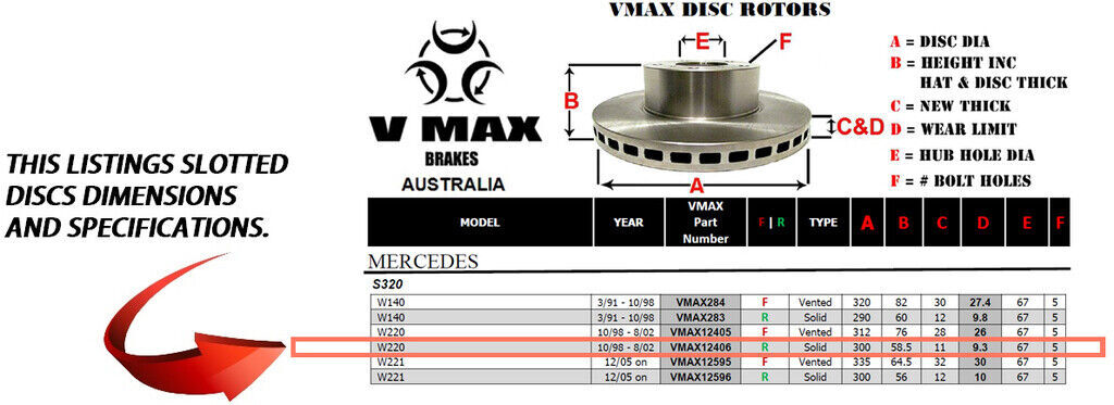 This sale is for a new pair (2 disc rotors) of Genuine VMAX Dimple Drilled & Slotted Performance Rear disc brake rotors to suit MERCEDES S320 W220 models built 1998 till 2002 and are a direct replacement item.