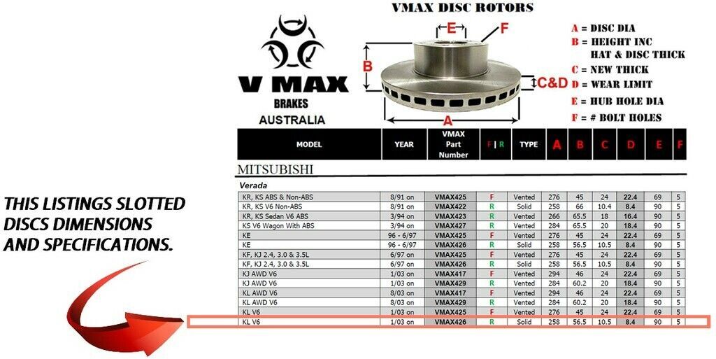 This sale is for a new pair (2 disc rotors) of Genuine VMAX Dimple Drilled & Slotted Performance Rear disc brake rotors to suit MITSUBISHI Verada KL V6 models built 2003 Onwards and are a direct replacement item.