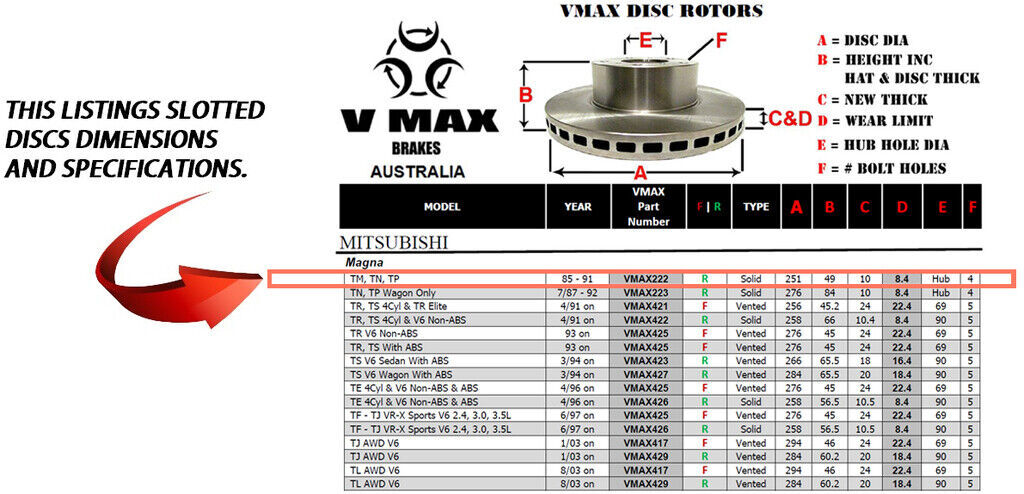 This sale is for a new pair (2 disc rotors) of Genuine VMAX Dimple Drilled & Slotted Performance Rear disc brake rotors to suit MITSUBISHI Magna TM TN TP models built 1985 till 1991 and are a direct replacement item.