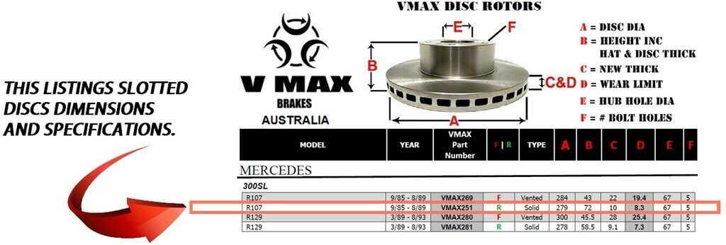 This sale is for a new pair (2 disc rotors) of Genuine VMAX Dimple Drilled & Slotted Performance Rear disc brake rotors to suit MERCEDES 300SL R107 models built 1985 till 1989 and are a direct replacement item.