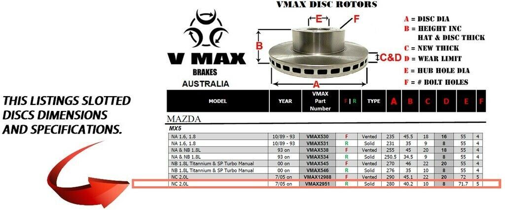This sale is for a new pair (2 disc rotors) of Genuine VMAX Dimple Drilled & Slotted Performance Rear disc brake rotors to suit MAZDA MX5 NC 2.0L models built 2005 Onwards and are a direct replacement item.