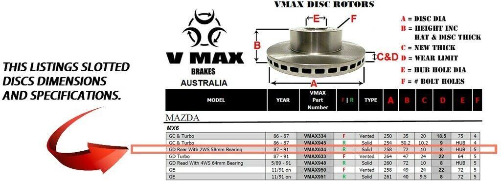 This sale is for a new pair (2 disc rotors) of Genuine VMAX Dimple Drilled & Slotted Performance Rear disc brake rotors to suit MAZDA MX6 GD Rear With 2WS 58mm Bearing models built 1987 till 1991 and are a direct replacement item.