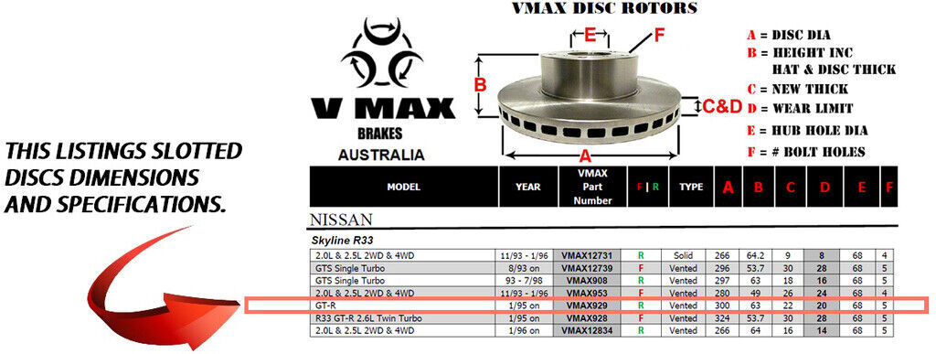 This sale is for a new pair (2 disc rotors) of Genuine VMAX Dimple Drilled & Slotted Performance Rear disc brake rotors to suit NISSAN Skyline R33 GTR models built 1995 Onwards and are a direct replacement item.
