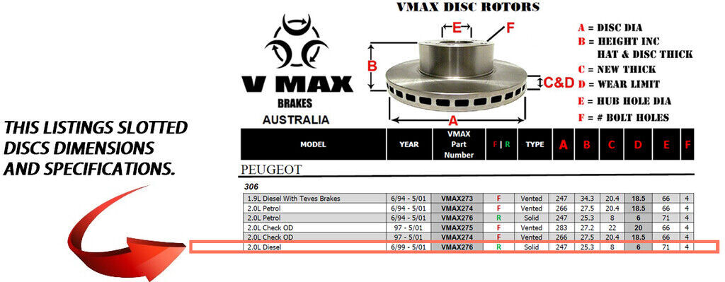 This sale is for a new pair (2 disc rotors) of Genuine VMAX Dimple Drilled & Slotted Performance Rear disc brake rotors to suit PEUGEOT 306 2.0L Diesel models built 1999 till 2001 and are a direct replacement item.