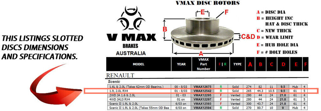 This sale is for a new pair (2 disc rotors) of Genuine VMAX Dimple Drilled & Slotted Performance Rear disc brake rotors to suit RENAULT Scenic 1.9 2.0L RX4 models built 2001 till 2003 and are a direct replacement item.