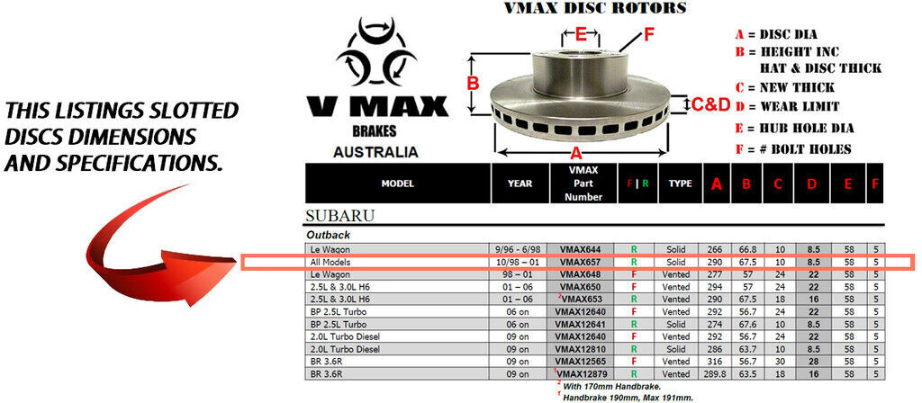 This sale is for a new pair (2 disc rotors) of Genuine VMAX Dimple Drilled & Slotted Performance Rear disc brake rotors to suit SUBARU Outback All Models models built 1998 till 2001 and are a direct replacement item.
