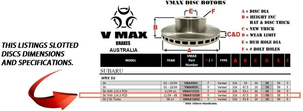 This sale is for a new pair (2 disc rotors) of Genuine VMAX Dimple Drilled & Slotted Performance Rear disc brake rotors to suit SUBARU WRX Sti With 114.3 PCD models built 2004 till 2008 and are a direct replacement item.