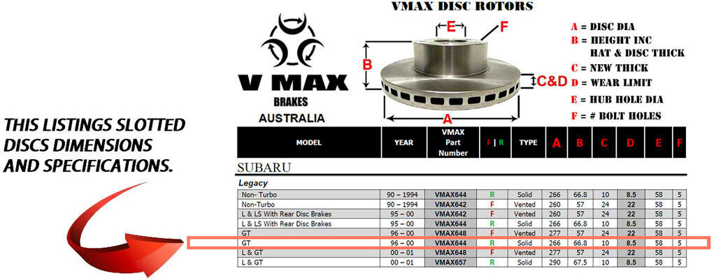 This sale is for a new pair (2 disc rotors) of Genuine VMAX Dimple Drilled & Slotted Performance Rear disc brake rotors to suit SUBARU Legacy GT models built 1996 till 2000 and are a direct replacement item.