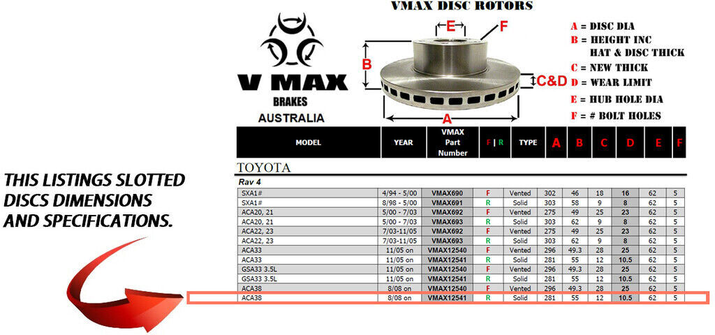 This sale is for a new pair (2 disc rotors) of Genuine VMAX Dimple Drilled & Slotted Performance Rear disc brake rotors to suit TOYOTA Rav 4 ACA38 models built 2008 Onwards and are a direct replacement item.