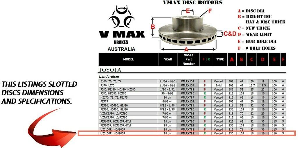 This sale is for a new pair (2 disc rotors) of Genuine VMAX Dimple Drilled & Slotted Performance Rear disc brake rotors to suit TOYOTA Landcruiser UZJ100R HDJ100R models built 1998 Onwards and are a direct replacement item.