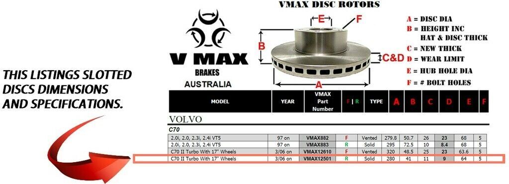 This sale is for a new pair (2 disc rotors) of Genuine VMAX Dimple Drilled & Slotted Performance Rear disc brake rotors to suit VOLVO C70 II Turbo With 17" Wheels models built 2006 Onwards and are a direct replacement item.