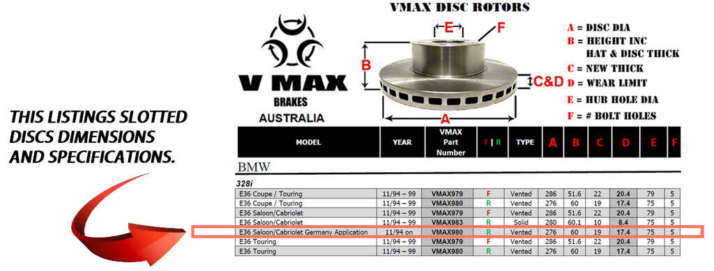 This sale is for a new pair (2 disc rotors) of Genuine VMAX Dimple Drilled & Slotted Performance Rear disc brake rotors and a matching Rear set of brake pads to suit BMW 328i E36 Saloon Cabriolet Germany App models built 1994 Onwards and are a direct replacement item.
