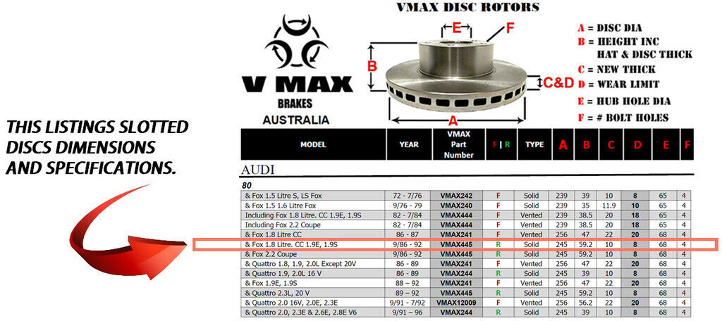 This sale is for a new pair (2 disc rotors) of Genuine VMAX Dimple Drilled & Slotted Performance Rear disc brake rotors and a matching Rear set of brake pads to suit AUDI 80 Fox 1.8 Litre. CC 1.9E 1.9S models built 1986 till 1992 and are a direct replacement item.