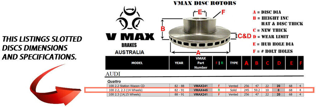 This sale is for a new pair (2 disc rotors) of Genuine VMAX Dimple Drilled & Slotted Performance Rear disc brake rotors and a matching Rear set of brake pads to suit AUDI Quattro 100 2.2 2.3 14 Wheels models built 1982 till 1991 and are a direct replacement item.