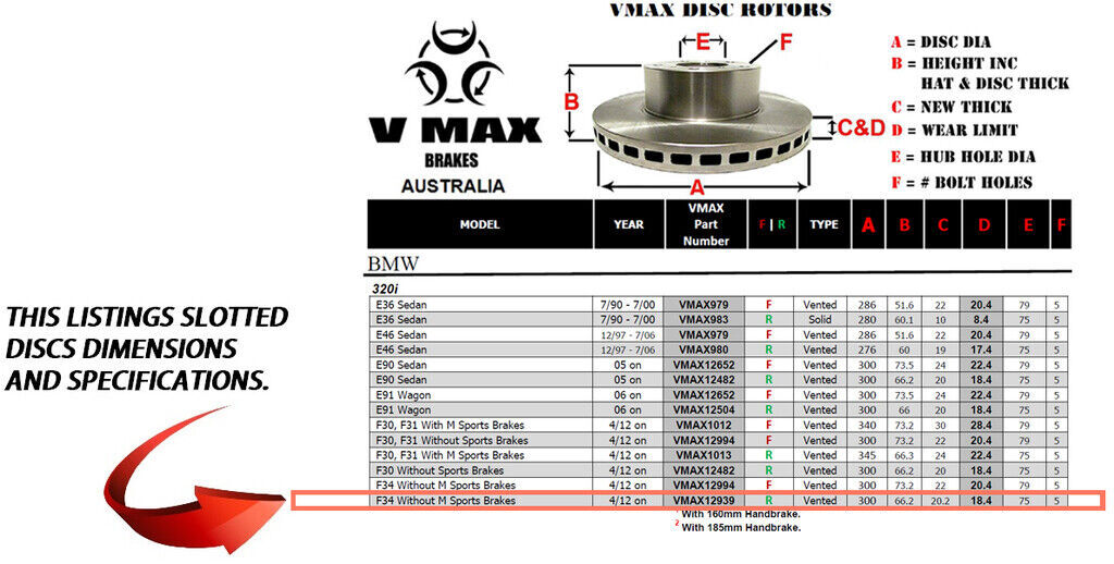 This sale is for a new pair (2 disc rotors) of Genuine VMAX Dimple Drilled & Slotted Performance Rear disc brake rotors and a matching Rear set of brake pads to suit BMW 320i F34 Without M Sports Brakes models built 2012 Onwards and are a direct replacement item.