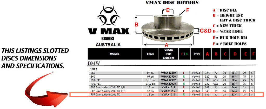 This sale is for a new pair (2 disc rotors) of Genuine VMAX Dimple Drilled & Slotted Performance Rear disc brake rotors and a matching Rear set of brake pads to suit BMW 520d F07 Gran turismo 2.0L TD models built 2012 Onwards and are a direct replacement item.