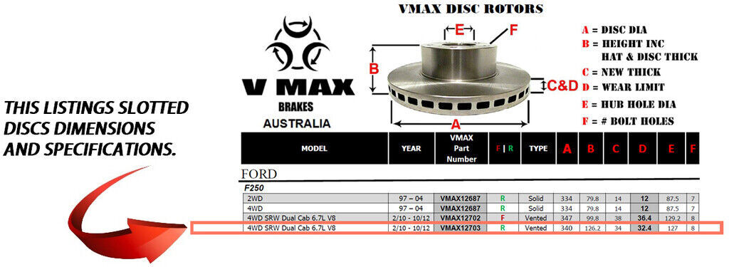 This sale is for a new pair (2 disc rotors) of Genuine VMAX Dimple Drilled & Slotted Performance Rear disc brake rotors and a matching Rear set of brake pads to suit FORD F250 4WD SRW Dual Cab 6.7L V8 models built 2010 till 2012 and are a direct replacement item.