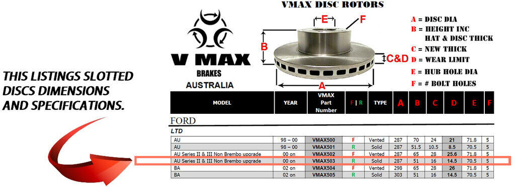 This sale is for a new pair (2 disc rotors) of Genuine VMAX Dimple Drilled & Slotted Performance Rear disc brake rotors and a matching Rear set of brake pads to suit FORD LTD AU2 & AU3 models built 2000 Onwards and are a direct replacement item.