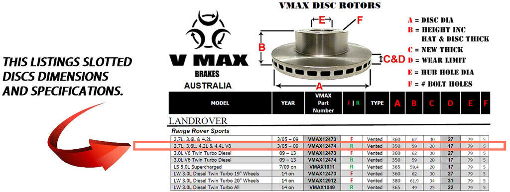 This sale is for a new pair (2 disc rotors) of Genuine VMAX Dimple Drilled & Slotted Performance Rear disc brake rotors and a matching Rear set of brake pads to suit LANDROVER R-Rover Sport 2.7L 3.6L 4.2L 4.4L V8 models built 2005 till 2009 and are a direct replacement item.