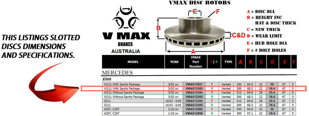 This sale is for a new pair (2 disc rotors) of Genuine VMAX Dimple Drilled & Slotted Performance Rear disc brake rotors and a matching Rear set of brake pads to suit MERCEDES E500 W211 With Sports Package models built 2002 Onwards and are a direct replacement item.