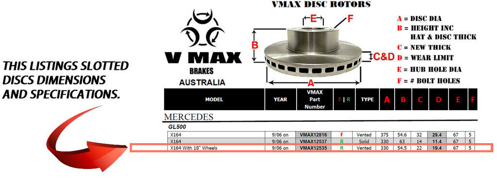 This sale is for a new pair (2 disc rotors) of Genuine VMAX Dimple Drilled & Slotted Performance Rear disc brake rotors and a matching Rear set of brake pads to suit MERCEDES GL500 X164 With 18" Wheels models built 2006 Onwards and are a direct replacement item.