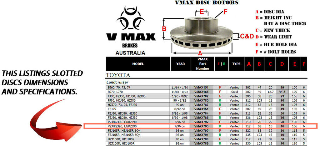 This sale is for a new pair (2 disc rotors) of Genuine VMAX Dimple Drilled & Slotted Performance Rear disc brake rotors and a matching Rear set of brake pads to suit TOYOTA Landcruiser VZJ90 KZJ90 LJ90 RZJ90 models built 1996 Onwards and are a direct replacement item.