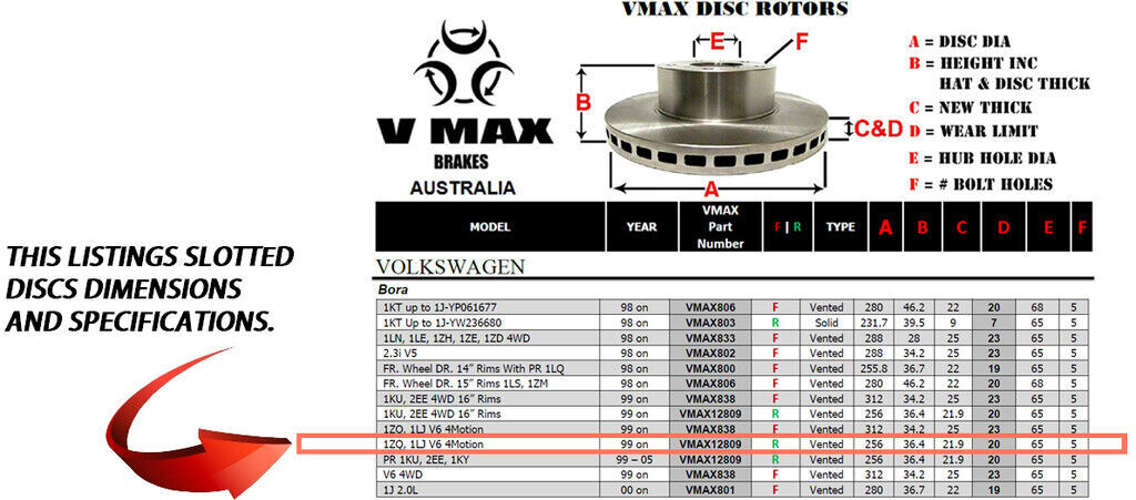This sale is for a new pair (2 disc rotors) of Genuine VMAX Dimple Drilled & Slotted Performance Rear disc brake rotors and a matching Rear set of brake pads to suit VOLKSWAGEN Bora 1ZQ 1LJ V6 4Motion models built 1999 Onwards and are a direct replacement item.
