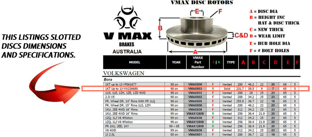 This sale is for a new pair (2 disc rotors) of Genuine VMAX Dimple Drilled & Slotted Performance Rear disc brake rotors and a matching Rear set of brake pads to suit VOLKSWAGEN Bora 1KT Up to 1J-YW236680 models built 1998 Onwards and are a direct replacement item.