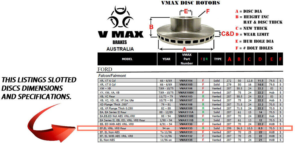 This sale is for a new pair (2 disc rotors) of Genuine VMAX Dimple Drilled & Slotted Performance Rear disc brake rotors to suit FORD Falcon & Fairmont EF EL inc XR6 XR8 models built 1994 Onwards and are a direct replacement item.