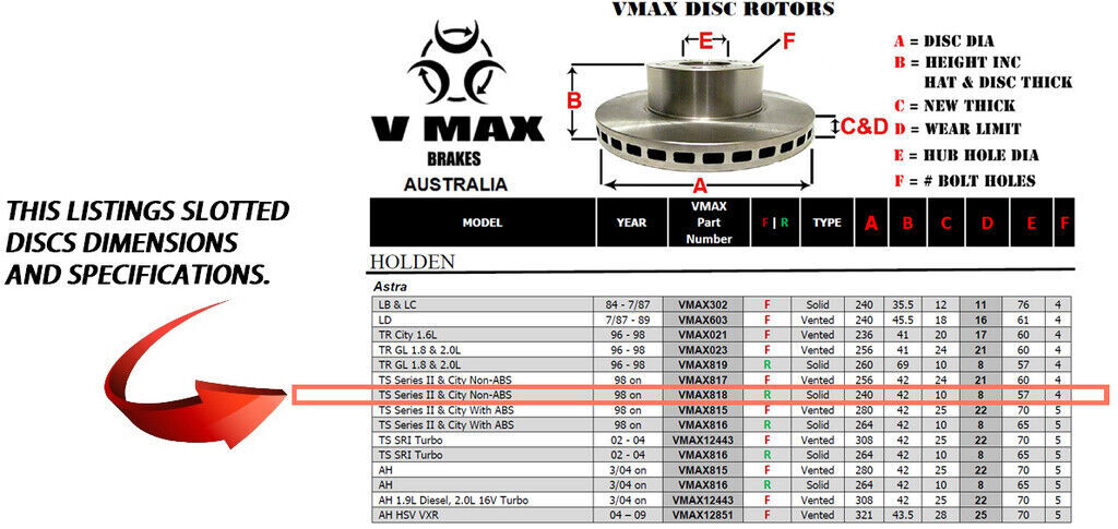 This sale is for a new pair (2 disc rotors) of Genuine VMAX Dimple Drilled & Slotted Performance Rear disc brake rotors to suit HOLDEN Astra TS Series II City Non-ABS models built 1998 Onwards and are a direct replacement item.