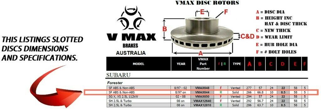 This sale is for a new pair (2 disc rotors) of Genuine VMAX Dimple Drilled & Slotted Performance Rear disc brake rotors to suit SUBARU Forester SF ABS Non-ABS models built 1997 Onwards and are a direct replacement item.